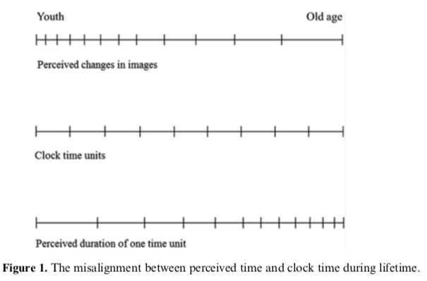 Thời gian đang diễn ra trong con mắt của tâm trí. Nó liên quan đến số lượng hình ảnh tinh thần mà não tiếp nhận và xử lý được cũng như trạng thái của bộ não khi chúng ta già đi. Tuổi tác làm giảm tốc độ thiếp thu và xử lý hình ảnh tinh thần vì một số lý do đến từ thị giác, độ phức tạp của não và con đường truyền thông tin. Những sự thay đổi trong xử lý hình ảnh này dẫn đến cảm giác thời gian trôi nhanh hơn.