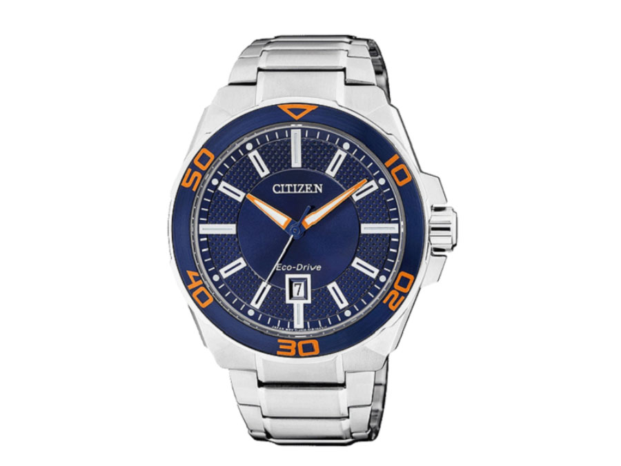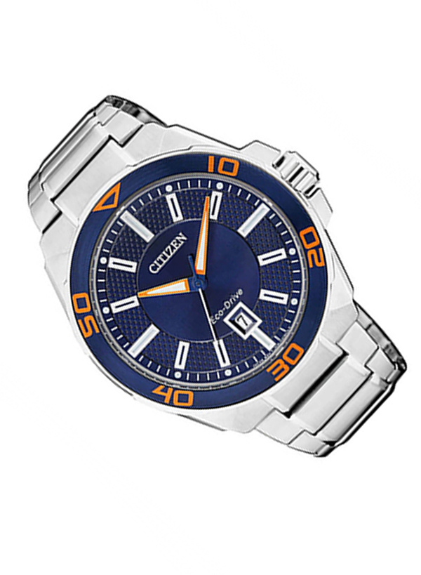 Đồng hồ nam Citizen AW1191-51L mang “diện mạo” của một chiếc đồng hồ thể thao với những đường nét khỏe khoắn. Mặt số được thiết kế dạng tròn kết hợp cùng khung viền vỏ ngoài dày dặn, tạo hình độc đáo mang đến trải nghiệm khác lạ cho người sử dụng. Bên trong mặt số được phối màu nền xanh lam thời thượng điểm chút sắc cam của những con số, là điểm nhấn nổi bật của giúp chiếc đồng hồ này gây được thiện cảm ấn tượng. Vạch số thanh mảnh, rõ ràng được phủ dạ quang nổi bật trên nền mặt xanh giúp việc xem giờ trở nên dễ dàng ngay cả khi trong điều kiện thiếu sáng. Chức năng hiển thị lịch ngày độc đáo được đặt lùi xuống góc 6 giờ cùng thiết kế kim chỉ giờ, phút viền cam tôn nên vẻ đẹp hiện đại vốn có. Đường kính mặt đồng hồ 42mm, có thể khẳng định rằng đây là kích cỡ phù hợp với cổ tay chắc khoẻ của người đàn ông, giúp họ phô ra những đường nét mạnh mẽ hấp dẫn mọi ánh nhìn.