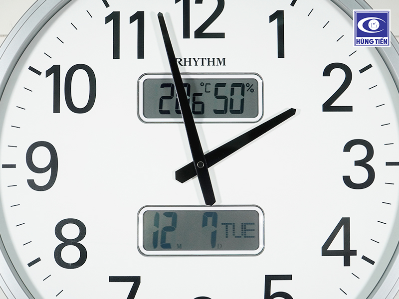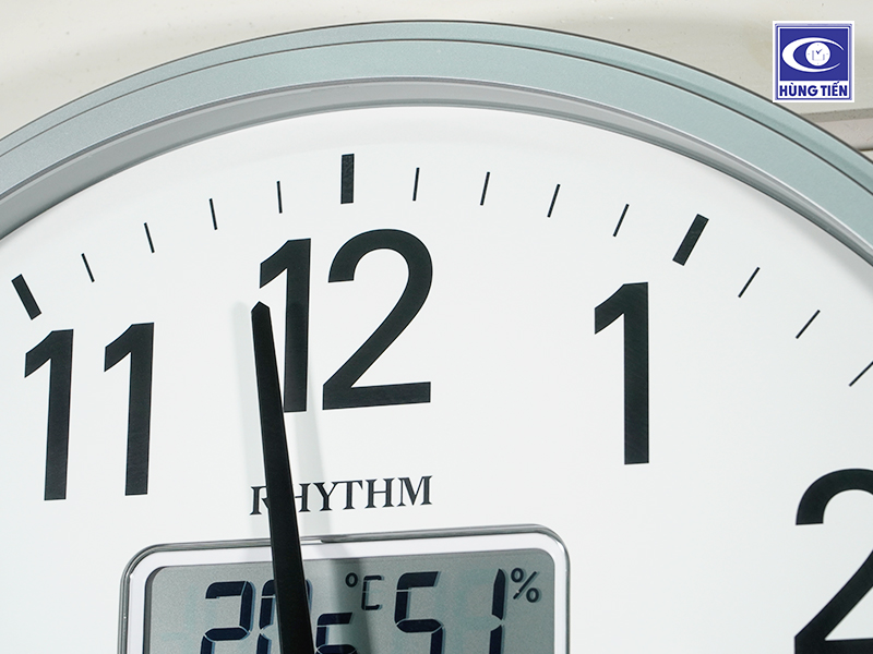 Trên mặt số đó vẫn là sự xuất hiện của cọc 12 số tương ứng với 12 khung giờ và các cọc index chỉ phút thường thấy ở mặt số các mẫu đồng hồ thông dụng. Tuy nhiên, thương hiệu Rhythm đã bổ sung thêm hai mặt hiển thị điện tử, bên trên thể hiện nhiệt độ và độ ẩm hiện tại, khung hiển thị bên dưới là lịch thứ - ngày - tháng. Bộ chức năng này đã tạo sự khác biệt cho đồng hồ Rhythm CFG709NR19.