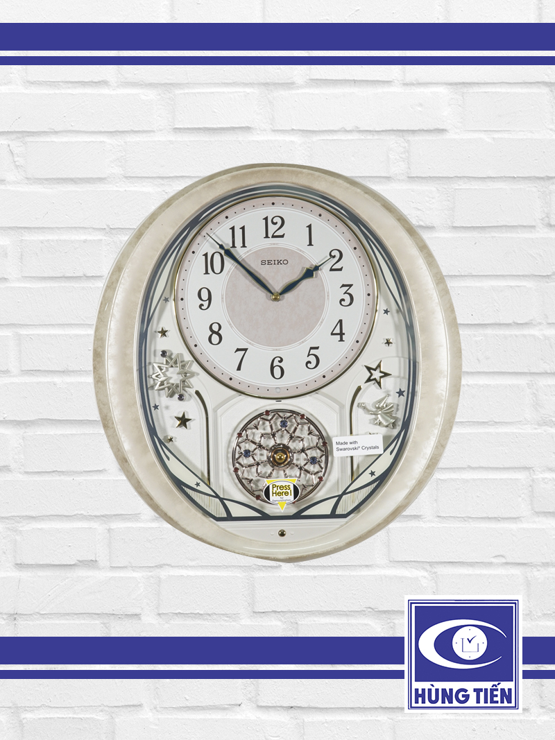 Đồng hồ treo tường Seiko QXM370P có dạng oval kích thước Kích thước: 41,6x 38,5x7,6cm, với hai phần được phân chia rõ ràng: mặt số hiển thị giờ và phần phát nhạc với các chi tiết trang trí tráng lệ. Đầu tiên, nói về mặt số hiển thị giờ của Seiko QXM370P, phần này được thiết kế vô cùng đơn giản với 12 cọc giờ Arab và bộ đôi kim Cathedral với những nét cong uyển chuyển, mềm mại. Chính thiết kế không cầu kỳ này của Seiko QXM370P đã nâng các chi tiết đắt giá của sản phẩm lên. Đối xứng với mặt số hiển thị giờ là một “bánh xe” phát nhạc tuyệt đẹp với sự hiện diện của những viên pha lê Swarovski màu sắc. Những phần trống còn lại thì được lấp đời bởi hình ảnh ngôi sao, cô tiên,... trông vô cùng đẹp mắt.